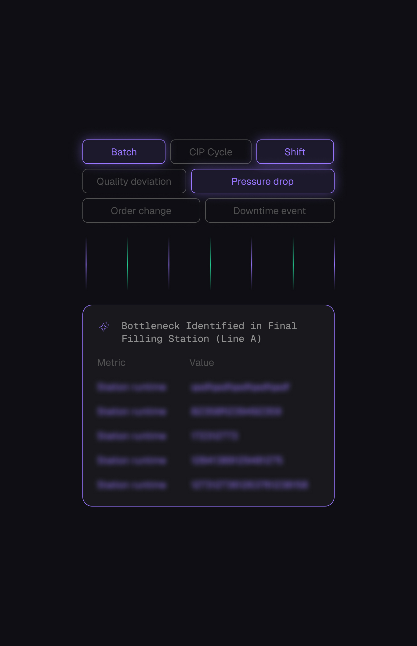 Automatically identify events like batch starts, clean-in-place cycles, and quality deviations. No more manual tagging or retrospective guesswork.